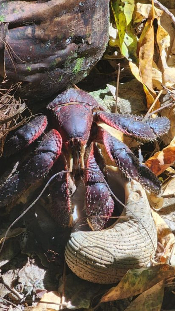 You may run across these rather large, but totally harmless coconut crabs in the forested areas