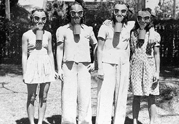 March, when it was time to go back to school, each child was issued a gas mask. It was required that they carry the masks with them throughout the day, slung over their shoulder, along with a heavy canister.