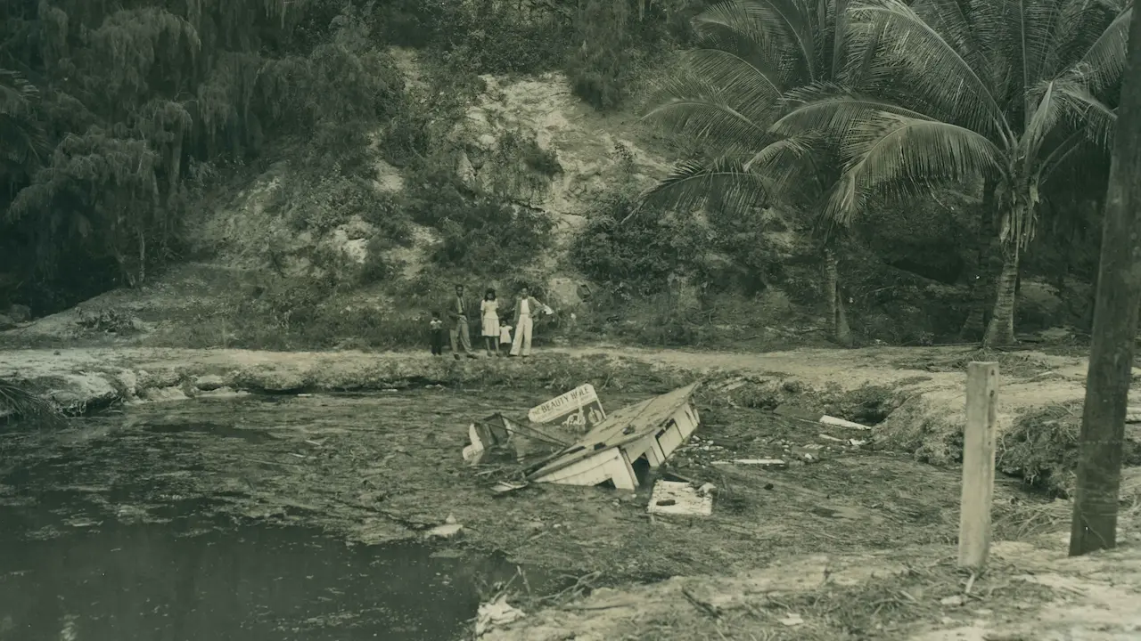 Over by the Beauty Hole, a popular local swimming spot, the wave lifted a building and placed it right in the middle of the swimming hole. After that, the kids would jump in, swim out, and climb up on the roof. “We would take a stick and push on the rocks,” Gladys explained, “and push that building around.” The wreckage stayed there for quite some time before they figured out how to dismantle it and pull it out.